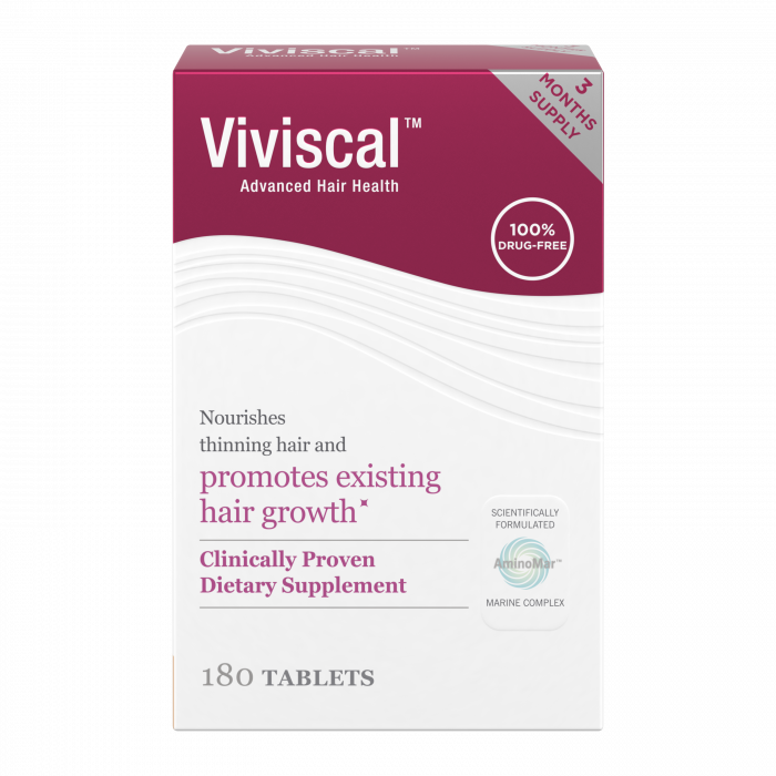 Viviscal Extra Strength hair vitamin supplements for women nourish thinning hair and promote existing hair growth from within.* Everyday stress, hormonal changes, poor nutrition, age, menopause, post-pregnancy, heredity, medication and damage caused by the environment and overstyling can impact the health of your hair and lead to breakage and excess shedding. Therefore, it’s important to ensure that the hair and scalp are healthy, conditioned and nourished to maintain the ideal environment for healthy hair growth.* At Viviscal, we understand hair. The Viviscal Hair Growth* and Hair Care Programs provide a variety of ways to nourish your hair from the inside out, and the outside in. Viviscal Extra Strength dietary supplements supply vital nutrients to the hair follicle to prolong the anagen (growing) phase of the hair growth cycle, nourishing thinning hair and promoting hair growth.* Healthy hair starts from within. If your diet lacks specific nutrients, including vitamins, minerals or protein, it can affect the condition and strength of your hair. Viviscal Extra Strength dietary supplements contain the exclusive marine complex AminoMar®, as well as Biotin, Zinc, Vitamin C, Horsetail Extract and Iron, to nourish hair from within. Viviscal Extra Strength has been scientifically proven to nourish thinning hair and promote existing hair growth.* Use Viviscal Extra Strength hair growth* supplement as part of the complete Viviscal range, which provides a unique two-dimensional hair care system fusing the best of both worlds. Viviscal offers scientifically formulated products that promote healthy hair growth* from the inside (Viviscal Extra Strength dietary supplements) plus gorgeous hair on the outside (Densifying Elixir, Densifying Shampoo and Densifying Conditioner), and even provide instant coverage for thicker looking hair (Conceal & Densify Volumizing Fibers). Why Viviscal Extra Strength hair vitamins? • 100% drug free • Contains some ingredients of natural origins • Nourishes thinning hair and promotes existing hair growth from within* • #1 selling hair growth supplement in the U.S.+ • Surgery-free, easy-to-use solution for hair growth* • Scientifically proven to improve hair thickness and reduce shedding within 3-6 months++* • 93% of customers would recommend Viviscal Extra Strength to a friend+++ • Suitable for all hair types +Based on IRI data in Food Drug Mass category for 52 weeks ending Jan. 26, 2014 ++Thomas J. Stephens & Associates, Carrollton, TX (2012) +++U.S. Viviscal Customer Survey 2011